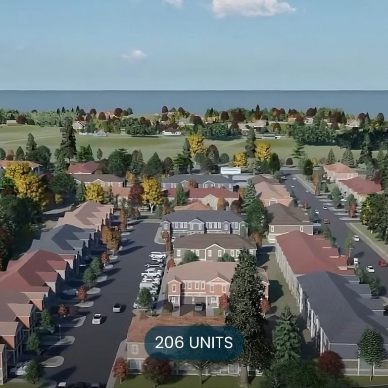 Beachwood Terrace, a residential development in Wasaga Beach, Ontario, is situated on Beachwood Road and spans 6.48 hectares (16 acres). It borders a four-lane highway to the south and Georgian Bay to the north. The proposed site plan includes 206 units, consisting of 2 detached homes, 14 semi-detached homes, 118 freehold townhomes, and 72 stacked townhomes.
