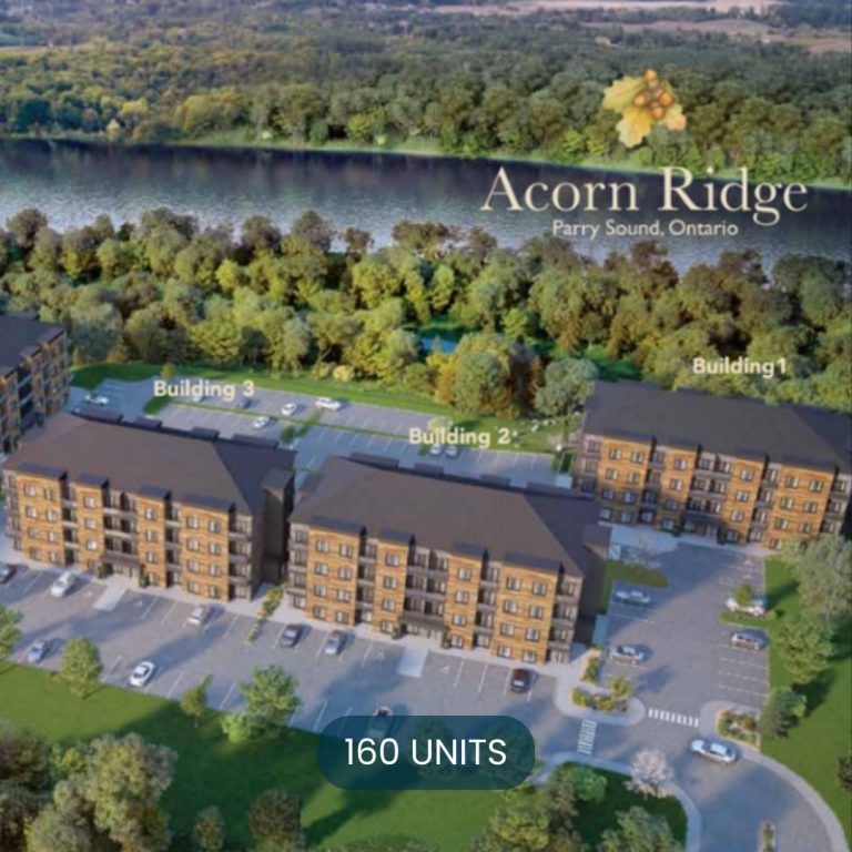 Acorn Ridge is an 8.1-acre development in an esteemed Parry Sound neighborhood. It has five four-story buildings with 160 units, boasting panoramic views of Afon Sequin and Parry Sound Harbour. It's a modern living space that blends seamlessly with nature's beauty.
